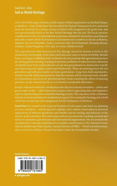 Soil as World Heritage celebrates a half century of field experiments on the Balti Steppe, in Moldova - where Dokuchaev first described the Typical Chernozem in 1877, protected from the elements by a unique system of shelter belts designed by the great man, and now provisionally listed as the first World Heritage Site for soil. The book presents contributions to the 2012 international symposium attended by researchers, practitioners and policy makers from the European Commission and countries as diverse as Belarus, Bulgaria, the Czech Republic, France, Germany, Italy , the Netherlands, Romania, Russia, Ukraine, United Kingdom, USA and, of course, Moldova itself.