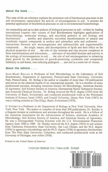 Preface Contributors 1 Enzyme Interactions with Clays and Clay-Organic Matter Complexes 2 Role of Soil Minerals in Transformations of Natural Organics and Xenobiotics in Soil 3 Anaerobic Microbial Transformation of Nonoxygenated Aromatic and Alicyclic Compounds in Soil Subsurface and Freshwater Sediments 4 Microbial Production of Cytokinins 5 Pseudomonadsa s Antagonists of Soilborne Plant Pathogens: Modes of Action and Genetic Analysis 6 Ecological Significance of the Biological Activity in Soil 7 The Significance of Soil Microbial Biomass Estimations 8 Soil Lipids: Origin Nature Content Decomposition and Effect on Soil Physical Properties 9 Interactions Between Soil Microbial Communities and Organometallic Compounds 10 Effects of Microorganisms on the Environmental Mobility of Radionuclides 11 Viruses in the Soil Environment Index