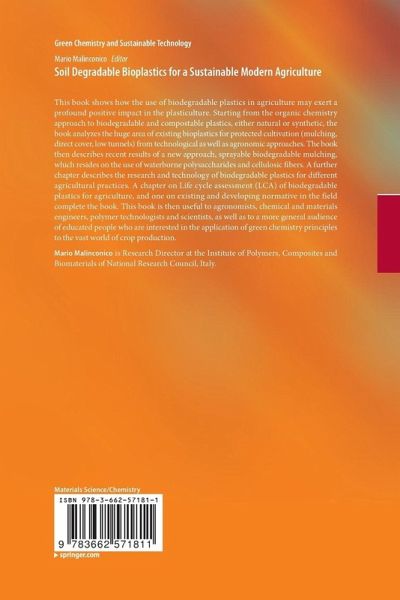 This book shows how the use of biodegradable plastics in agriculture can have a profound positive impact on plasticulture. Starting with an organic chemistry approach to biodegradable and compostable plastics, both natural and synthetic, it then analyzes the technological and agronomic aspects of existing bioplastics for protected cultivation (mulching, direct cover, low tunnels). It describes the new sprayable biodegradable mulching method, which is based on the use of waterborne polysaccharides and cellulosic fibers. A further chapter describes the research and technology of biodegradable plastics for different agricultural practices. It also includes chapters on life cycle assessment (LCA) of biodegradable plastics for agriculture, and existing and developing standards in the field. It is a valuable resource for agronomists, chemical and materials engineers, polymer technologists and scientists, as well as for a more general readership interested in the application of green chemistry principles to the vast world of crop production.