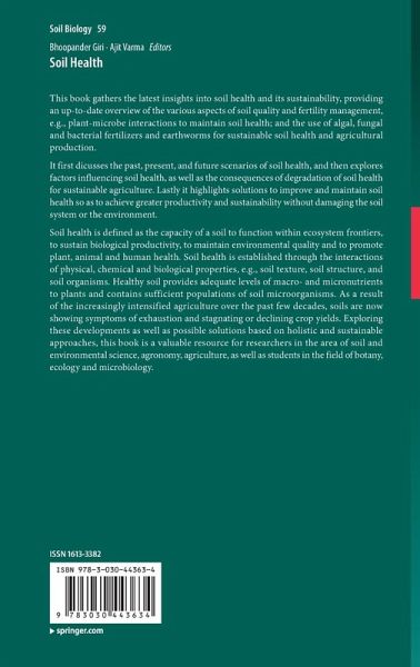 Soil health is defined as the capacity of a soil to function within ecosystem frontiers, to sustain biological productivity, to maintain environmental quality and to promote plant, animal and human health. Soil health is established through the interactions of physical, chemical and biological properties, e.g., soil texture, soil structure, and soil organisms. Healthy soil provides adequate levels of macro- and micronutrients to plants and contains sufficient populations of soil microorganisms. As a result of the increasingly intensified agriculture over the past few decades, soils are now showing symptoms of exhaustion and stagnating or declining crop yields. Exploring these developments as well as possible solutions based on holistic and sustainable approaches, this book is a valuable resource for researchers in the area of soil and environmental science, agronomy, agriculture, as well as students in the field of botany, ecology and microbiology.