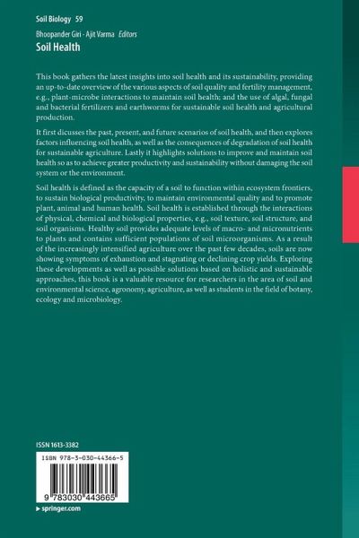 Soil health is defined as the capacity of a soil to function within ecosystem frontiers, to sustain biological productivity, to maintain environmental quality and to promote plant, animal and human health. Soil health is established through the interactions of physical, chemical and biological properties, e.g., soil texture, soil structure, and soil organisms. Healthy soil provides adequate levels of macro- and micronutrients to plants and contains sufficient populations of soil microorganisms. As a result of the increasingly intensified agriculture over the past few decades, soils are now showing symptoms of exhaustion and stagnating or declining crop yields. Exploring these developments as well as possible solutions based on holistic and sustainable approaches, this book is a valuable resource for researchers in the area of soil and environmental science, agronomy, agriculture, as well as students in the field of botany, ecology and microbiology.