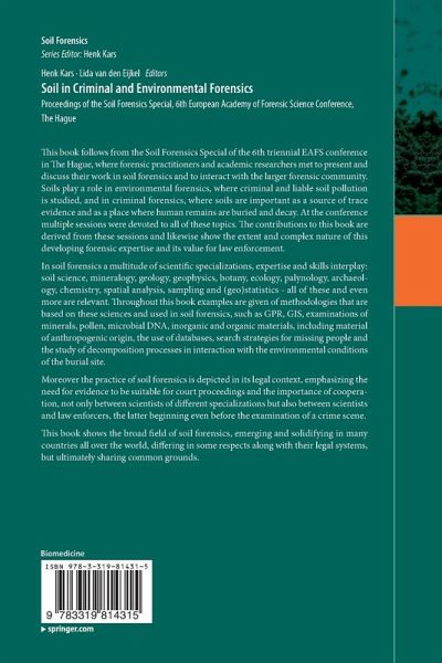 Preface.- SECTION I: Criminal soil forensics.- Soil traces: forensic examinations and legal context.- Chapter 1: Forensic palynology: Checking value of pollen analysis as a tool to identify crime scene in semiarid environments.- Chapter 2: Forensic Palynology: How pollen in dry grass can link to a crime scene.- Chapter 3: Geological analysis of soil and anthropogenic material. Three case studies.- Chapter 4: Forensic Soil Analysis: case study of looting at a Roman-Visigothic burial vault.- Chapter 5: Soil comparisons using small soil traces, a case report.- Chapter 6: Forensic comparison of soil samples.- Chapter 7: Reinstating soil examination as a trace evidence sub-discipline.- Chapter 8: Methodology of Forensic Soil Examination in Russia and a View on the World Standardization Process.- SECTION II: Environmental soil forensics.- Forensic tools for spatial and chemical analysis.- Chapter 9: Geographical Information Systems - a working example in the Brazilian Federal Police for fighting environmental crime.- Chapter 10: Forensic characterization of gasoline releases impacting the environment.- Chapter 11: A general overview of pesticides in soil: Requirement of sensitive and current residue analysis methods.- SECTION III: Searches and burial sites.- A. Searches: co-operation, strategies and techniques.- Chapter 12: A study of pH as an influencing factor in the survival of human remains at sites investigated by the Independent Commission for the Location of Victims Remains.- Chapter 13: Interdisciplinary approaches to the search and location of buried bodies: a United Kingdom context.- Chapter 14: Forensic Geophysics: How the GPR technique can help with forensic investigations.- Chapter 15: Filter paper adsorption and ninhydrin reagent as presumptive test for gravesoil.- B. Decomposition and degradation processes.- Chapter 16: Changes in soil microbial activity following cadaver decomposition during spring and summer months in southern Ontario.- Chapter 17:Soil fauna and their effects on decomposition within coniferous and deciduous tree soil samples.- Chapter 18: Analysis of decomposition fluid collected from carcasses decomposing in the presence and absence of insects.- Chapter 19: Forensic analysis of volatile compounds from decomposed remains in a soil environment.- Chapter 20: GC×GC-TOFMS, the Swiss knife for VOC mixtures analysis in soil forensic investigations.- Chapter 21: An investigation of the degradation of polymeric grave goods in soil environments.