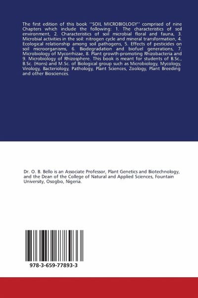 The first edition of this book ''SOIL MICROBIOLOGY'' comprised of nine Chapters which include the following: 1. The characteristics of soil environment, 2. Characteristics of soil microbial floral and fauna, 3. Microbial activities in the soil: nitrogen cycle and mineral transformation, 4. Ecological relationship among soil pathogens, 5. Effects of pesticides on soil microorganisms, 6. Biodegradation and biofuel generations, 7. Microbiology of Mycorrhizae, 8. Plant growth-promoting Rhizobacteria and 9. Microbiology of Rhizosphere. This book is meant for students of B.Sc., B.Sc. (Hons) and M.Sc. of Biological group such as Microbiology, Mycology, Virology, Bacteriology, Pathology, Plant Sciences, Zoology, Plant Breeding and other Biosciences.