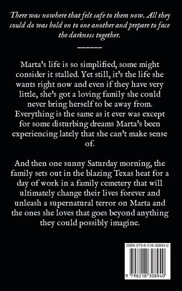 There was nowhere that felt safe to them now. All they could do was hold on to one another and prepare to face the darkness together. Marta's life is so simplified, some might consider it stalled. Yet still, it's the life she wants right now and even if they have very little, she's got a loving family she could never bring herself to be away from. Everything is the same as it ever was except for some disturbing dreams Marta's been experiencing lately that she can't make sense of. And then one sunny Saturday morning, the family sets out in the blazing Texas heat for a day of work in a family cemetery that will ultimately change their lives forever and unleash a supernatural terror on Marta and the ones she loves that goes beyond anything they could possibly imagine.