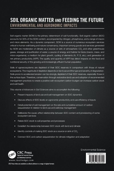 Soil organic matter (SOM) is the primary determinant of soil functionality. Soil organic carbon (SOC) accounts for 50% of the SOM content, accompanied by nitrogen, phosphorus, and a range of macro and micro elements. As a dynamic component, SOM is a source of numerous ecosystem services critical to human well-being and nature conservancy. Important among these goods and services generated by SOM include moderation of climate as a source or sink of atmospheric CO2 and other greenhouse gases, storage and purification of water, a source of energy and habitat for biota (macro, meso, and…mehr