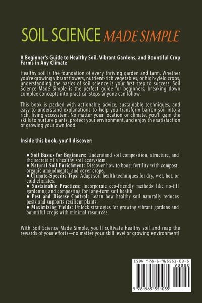 Soil Science Made Simple A Beginner's Guide to Healthy Soil, Vibrant Gardens, and Bountiful Crop Farms in Any Climate Healthy soil is the foundation of every thriving garden and farm. Whether you're growing vibrant flowers, nutrient-rich vegetables, or high-yield crops, understanding the basics of soil science is your first step to success. Soil Science Made Simple is the perfect guide for beginners, breaking down complex concepts into practical steps anyone can follow. This book is packed with actionable advice, sustainable techniques, and easy-to-understand explanations to help you transform barren soil into a rich, living ecosystem. No matter your location or climate, you'll gain the skills to nurture plants, protect your environment, and enjoy the satisfaction of growing your own food.What you'll learn:Soil Basics for Beginners: Understand soil composition, structure, and the secrets of a healthy soil ecosystem. Natural Soil Enrichment: Discover how to boost fertility with compost, organic amendments, and cover crops. Climate-Specific Tips: Adapt soil health techniques for dry, wet, hot, or cold climates. Sustainable Practices: Incorporate eco-friendly methods like no-till gardening and composting for long-term soil health. Pest and Disease Control: Learn how healthy soil naturally reduces pests and supports resilient plants. Maximizing Yields: Unlock strategies for growing vibrant gardens and bountiful crops with minimal resources. With Soil Science Made Simple, you'll cultivate healthy soil and reap the rewards of your efforts-no matter your skill level or growing environment.