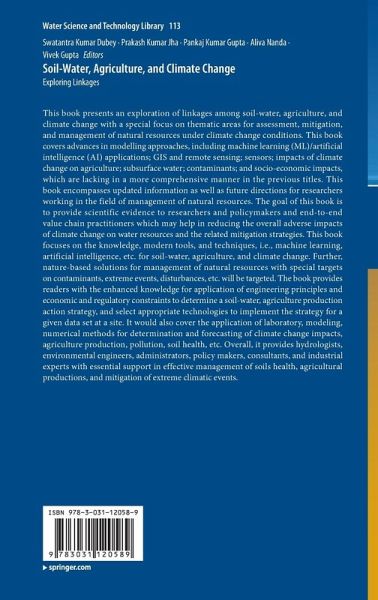This book presents an exploration of linkages among soil-water, agriculture, and climate change with a special focus on thematic areas for assessment, mitigation, and management of natural resources under climate change conditions. This book covers advances in modelling approaches, including machine learning (ML)/ artificial intelligence (AI) applications; GIS and remote sensing; sensors; impacts of climate change on agriculture; subsurface water; contaminants; and socio-economic impacts, which are lacking in a more comprehensive manner in the previous titles. This book encompasses updated information as well as future directions for researchers working in the field of management of natural resources. The goal of this book is to provide scientific evidence to researchers and policymakers and end-to-end value chain practitioners which may help in reducing the overall adverse impacts of climate change on water resources and the related mitigation strategies. This book focuses on the knowledge, modern tools, and techniques, i.e., machine learning, artificial intelligence, etc. for soil-water, agriculture, and climate change. Further, nature-based solutions for management of natural resources with special targets on contaminants, extreme events, disturbances, etc. will be targeted. The book provides readers with the enhanced knowledge for application of engineering principles and economic and regulatory constraints to determine a soil-water, agriculture production action strategy, and select appropriate technologies to implement the strategy for a given data set at a site. It would also cover the application of laboratory, modeling, numerical methods for determination and forecasting of climate change impacts, agriculture production, pollution, soil health, etc. Overall, it provides hydrologists, environmental engineers, administrators, policy makers, consultants, and industrial experts with essential support in effective management of soils health, agricultural productions, and mitigation of extreme climatic events.