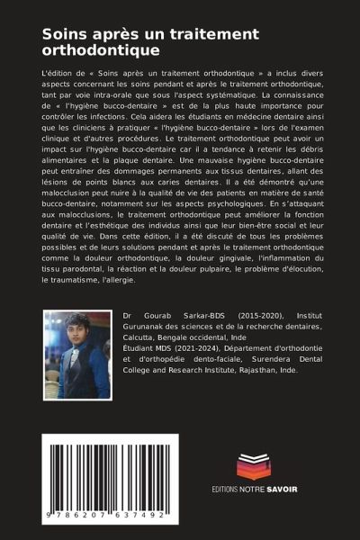 L'édition de « Soins après un traitement orthodontique » a inclus divers aspects concernant les soins pendant et après le traitement orthodontique, tant par voie intra-orale que sous l'aspect systématique. La connaissance de « l'hygiène bucco-dentaire » est de la plus haute importance pour contrôler les infections. Cela aidera les étudiants en médecine dentaire ainsi que les cliniciens à pratiquer « l'hygiène bucco-dentaire » lors de l'examen clinique et d'autres procédures. Le traitement orthodontique peut avoir un impact sur l'hygiène bucco-dentaire car il a tendance à retenir les débris alimentaires et la plaque dentaire. Une mauvaise hygiène bucco-dentaire peut entraîner des dommages permanents aux tissus dentaires, allant des lésions de points blancs aux caries dentaires. Il a été démontré qu'une malocclusion peut nuire à la qualité de vie des patients en matière de santé bucco-dentaire, notamment sur les aspects psychologiques. En s'attaquant aux malocclusions, le traitement orthodontique peut améliorer la fonction dentaire et l'esthétique des individus ainsi que leur bien-être social et leur qualité de vie. Dans cette édition, il a été discuté de tous les problèmes possibles et de leurs solutions pendant et après le traitement orthodontique comme la douleur orthodontique, la douleur gingivale, l'inflammation du tissu parodontal, la réaction et la douleur pulpaire, le problème d'élocution, le traumatisme, l'allergie.