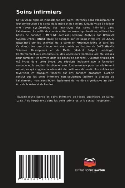 Cet ouvrage examine l'importance des soins infirmiers dans l'allaitement et leur contribution à la santé de la mère et de l'enfant. L'étude visait à réaliser une revue systématique des avantages des soins infirmiers dans l'allaitement. La méthode choisie a été une revue systématique, utilisant les bases de données : MEDLINE (Medical Literature Analysis and Retrieval System Online), BNDEF (Base de données sur les soins infirmiers) et LILACS (Littérature sur les sciences de la santé en Amérique latine et dans les Caraïbes). Les descripteurs ont été choisis en fonction de DeCS (Health Sciences Descriptors) et de MeSH (Medical Subject Headings). Conformément aux descripteurs, des opérateurs booléens ont été utilisés pour combiner les termes dans les bases de données. Quatorze articles ont été inclus dans cette étude. Les résultats indiquent que la formation continue et le soutien émotionnel sont fondamentaux pour un allaitement réussi, ce qui suggère la nécessité de politiques de santé plus solides qui favorisent les pratiques fondées sur des données probantes. L'article conclut que les soins infirmiers non seulement facilitent la pratique de l'allaitement, mais contribuent également de manière significative au bien-être de la mère et de l'enfant.
