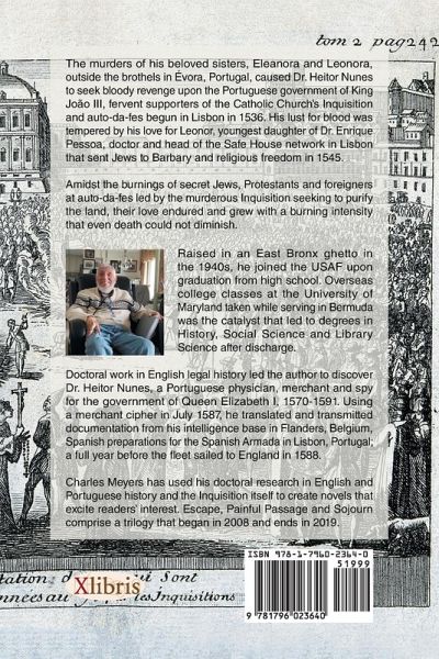 The murders of his beloved sisters, Eleanora and Leonora, outside the brothels in Évora, Portugal, caused Dr. Heitor Nunes to seek bloody revenge upon the Portuguese government of King João III, fervent supporters of the Catholic Church's Inquisition and auto-da-fes begun in Lisbon in 1536. His lust for blood was tempered by his love for Leonor, youngest daughter of Dr. Enrique Pessoa, doctor and head of the Safe House network in Lisbon that sent Jews to Barbary and religious freedom in 1545. Amidst the burnings of secret Jews, Protestants and foreigners at auto-da-fes led by the murderous Inquisition seeking to purify the land, their love endured and grew with a burning intensity that even death could not diminish.