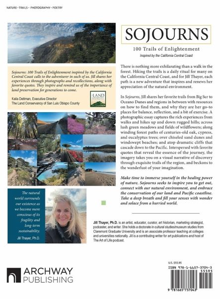 There is nothing more exhilarating than a walk in the forest. Hiking the trails is a daily ritual for many on the California Central Coast, and for Jill Thayer, each path is a new adventure that inspires and renews her appreciation of the natural environment. In Sojourns, Jill shares her favorite trails from Big Sur to Oceano Dunes and regions in between with resources on how to find them, and why they are her go-to places for balance, reflection, and a bit of exercise. A photographic essay captures the rich experiences from walks and hikes up and down rugged hills; across lush green meadows and fields of wildflowers; along winding forest paths of centuries-old oak, cypress, and eucalyptus trees; over chiseled sand dunes and windswept beaches; and atop dramatic cliffs that cascade down to the Pacific. Interspersed with favorite quotes that reveal the essence of the journey, the imagery takes you on a visual narrative of discovery through exquisite trails of the region, and beckons to the wanderlust of your imagination. Make time to immerse yourself in the healing power of nature. Sojourns seeks to inspire you to get out, connect with our natural environment, and embrace the conservation of our land and Pacific coastline. Take a deep breath and fill your senses with wonder and solace from a hurried world.