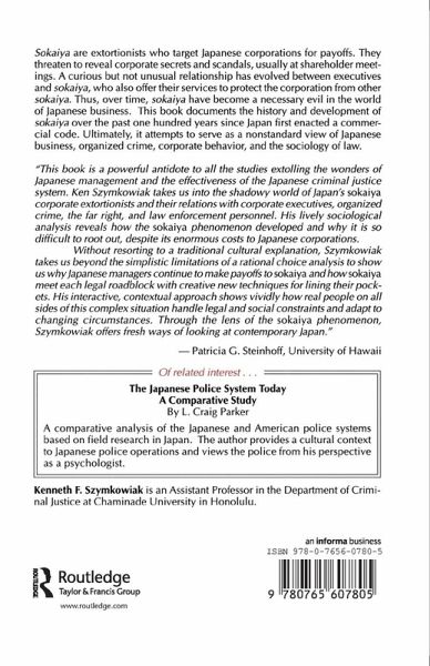 Sokaiya are extortionists who target Japanese corporations for payoffs. They threaten to reveal corporate secrets and scandals, usually at shareholder meetings. This book explores the curious but not unusual relationship that grows between executives and sokaiya, who also offer their services to protect the corporation from other sokaiya, thus becoming a necessary evil in the world of Japanese business. The book documents the history and development of sokaiya over the past 100 years since Japan first enacted a commercial code. It includes interviews with police, lawyers, corporate executives, as well as sokaiya and members of the yakuza (traditional Japanese gangsters).