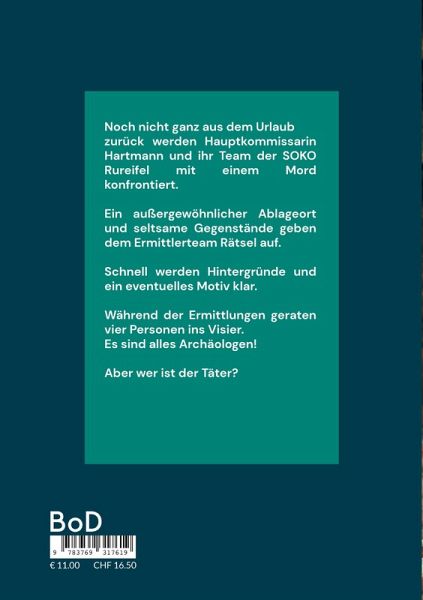 Noch nicht ganz aus dem Urlaub zurück werden Hauptkommissarin Hartmann und ihr Team der SOKO Rureifel mit einem Mord konfrontiert. Ein außergewöhnlicher Ablageort und seltsame Gegenstände geben dem Ermittlerteam Rätsel auf. Schnell werden Hintergründe und ein eventuelles Motiv klar. Während der Ermittlungen geraten vier Personen ins Visier. Es sind alles Archäologen! Aber wer ist der Täter?