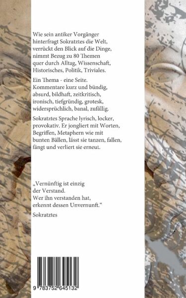 Gleich seinem Namensvetter Sokrates, der vor zweieinhalbtausend Jahren die Athener mit seinen Erkenntnissen in Unruhe versetzte, hinterfragt der Zeitgenosse Sokratztes unsere Welt, eckt an, wo es juckt, verrückt den Blick auf die Dinge. ,Mit 80 Fragen um die Welt' ist ein Mix aus Trivialem und Tiefgründigem, satirisch-philosophischen Gedankenspielen, intelligenter Zeitdiagnose, Närrischem und Nachdenklichem, in einer Form von Kurztexten, die mal an Lyrik, mal an Kolumne erinnern. Der moderne Sokrates jongliert auf unterhaltsame Art mit den Wirklichkeiten und regt dabei zu freiem Denken an.