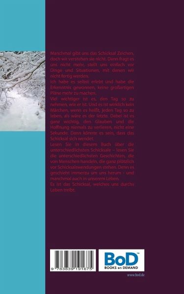 Manchmal gibt uns das Schicksal Zeichen, doch wir verstehen sie nicht. Dann fragt es uns nicht mehr, stellt uns einfach vor Dinge und Situationen, mit denen wir nicht fertig werden. Ich habe es selbst erlebt und habe die Erkenntnis gewonnen, weder großartige Pläne zu machen noch langfristig zu denken. Viel wichtiger ist es, den Tag so zu nehmen, wie er ist. Und es ist wirklich kein Märchen, wenn es heißt, jeden Tag so zu leben, als wäre es der letzte. Dabei ist es ganz wichtig, den Glauben und die Hoffnung niemals zu verlieren, nicht eine Sekunde. Dann könnte es sein, dass das Schicksal sich wendet. Lesen Sie in diesem Buch über die unterschiedlichsten Schicksale - lesen Sie die unterschiedlichsten Geschichten, die von Menschen handeln, die ganz plötzlich vor Schicksalswendungen stehen. Denn es geschieht immerzu um uns herum, und manchmal auch in unserem Leben. Es ist das Schicksal, welches uns durchs Leben treibt.