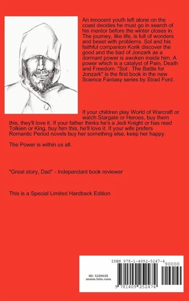 An innocent youth left alone on the coast decides he must go in search of his mentor before the winter closes in. The journey, like life, is full of wonders and beset with problems. Sol and his faithful companion Korik discover the good and the bad of Jonzark as a dormant power is awoken inside him. A power which is a catalyst of Pain, Death and Freedom. "Sol : The Battle for Jonzark" is the first book in the new Science Fantasy series by Strad Ford. If your children play World of Warcraft or watch Stargate or Heroes, buy them this. If your father thinks he's a Jedi Knight or has read Tolkien or King, buy him this. If your wife prefers Romantic Period novels buy her something else, keep her happy. The Power is within us all.