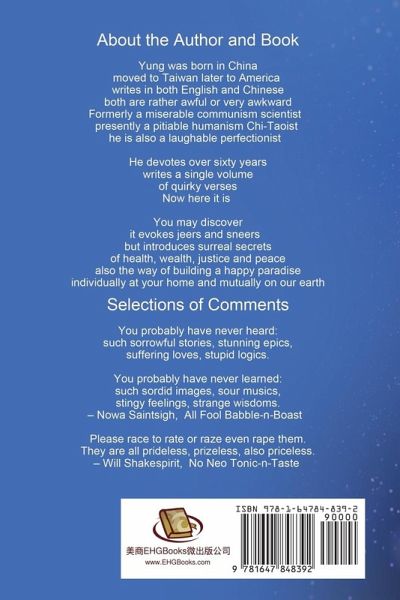 You probably have never heard: such sorrowful stories, stunning epics, suffering loves, stupid logics. You probably have never learned: such sordid images, sour musics, stingy feelings, strange wisdoms. - Nova Saintsigh, All Fool Babble-n-Boast Please race to rate or raze even rape them. They are all prideless, prizeless, also priceless. - Will Shakespirit, No Neo Tonic-n-Taste ¿¿¿¿¿¿¿¿¿ ¿¿¿¿¿¿¿¿¿¿¿¿¿¿ ¿¿¿¿¿¿¿¿¿¿¿¿ ¿¿¿¿¿¿¿¿¿ ¿¿¿¿¿¿¿¿¿¿¿¿¿¿ ¿¿¿¿¿¿¿¿¿¿¿¿ ¿¿¿¿¿¿¿¿¿¿¿¿ ¿¿¿¿¿¿¿¿¿¿¿¿¿¿¿¿ ¿¿¿¿¿¿¿¿¿¿¿¿¿¿ ¿¿¿¿¿¿¿¿¿¿¿¿ Yung was born in China, moved to Taiwan later to America. He writes in both English and Chinese, both are rather awful or very awkward Formerly a miserable communist scientist, presently a pitiable humanist Chi-Taoist. He is also a pop-yet-para perfectionist. He devotes over sixty years writes a single volume of quirky verses. Now here it is. You may discover it evokes laughter and sneers, but introduces surreal secrets of health, wealth, justice and peace, also the way of building a happy paradise individually at your home and mutually on our earth. ¿¿¿¿¿¿¿¿¿¿¿¿¿¿¿¿¿¿¿¿¿¿¿¿¿¿¿¿¿¿¿¿¿¿¿¿¿¿¿¿¿¿¿¿¿ ¿¿¿¿¿¿¿¿¿¿¿¿¿¿¿¿¿¿¿¿¿¿¿¿¿¿¿¿¿¿¿¿¿¿¿¿¿¿¿¿¿¿¿¿¿¿¿ ¿¿¿¿¿¿¿¿¿¿¿¿¿¿¿¿¿¿¿¿¿¿¿¿¿¿¿ ¿¿¿¿¿¿¿¿¿¿¿¿¿¿¿¿¿¿¿¿¿¿¿¿¿¿¿¿¿¿¿¿¿¿¿¿¿¿¿¿¿¿¿¿¿¿¿¿¿¿¿¿¿¿¿¿¿¿¿¿¿¿¿¿¿¿¿¿¿¿¿¿¿¿¿¿ ¿
