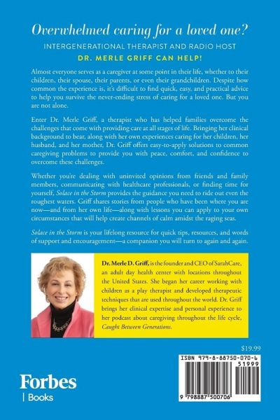 Life can change in an instant. Even when the water seems calm, you can be thrown suddenly into the unfamiliar storm of caregiving. Most people will serve as a caregiver at some point in their lives, whether to their children, their spouse, their parents, or even their grandchildren. Despite how common the experience is, it's difficult to find quick, easy, and practical advice to help you survive the never-ending stress of caring for a loved one. For anyone searching for support in moments of family crisis, Dr. Merle Griff's Solace in the Storm can be your guide. Griff, a therapist who has helped families overcome the challenges of providing care at all stages of life, offers easy-to-apply solutions to common caregiving problems. Whether it's dealing with uninvited opinions from friends and family members, communicating with healthcare professionals, or finding time for yourself, Solace in the Storm provides the direction you need to ride out even the roughest seas. Griff provides stories from people who have been where you are now-and her own life-to help readers get through what seems like the impossible. Caregiving can be needed at any point in your loved ones' lives. In this book, Griff looks at caregiving throughout the human lifecycle, starting with infancy through caring for adult parents. And she gives advice on how friends and family can help, either by lending a hand or by learning what to say-and what not to say. Solace in the Storm will serve as your lifelong resource for quick tips, resources, and words of support and encouragement-a companion you will turn to again and again.