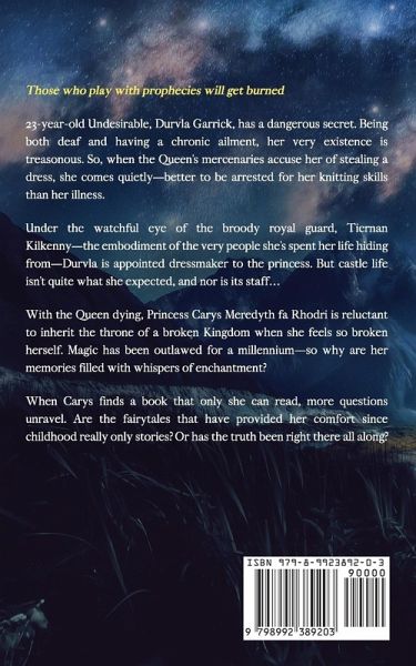 Those who play with prophecies will get burned... 23-year-old Undesirable, Durvla Garrick, has a dangerous secret. Being both deaf and having a chronic ailment, her very existence is treasonous. So, when the queen's mercenaries accuse her of stealing a dress, she comes quietly-better to be arrested for her knitting skills than her illness. Under the watchful eye of the broody royal guard, Tiernan Kilkenny-the embodiment of the very people she's spent her life hiding from-Durvla is appointed dressmaker to the princess. But castle life isn't quite what she expected, and nor is its staff... With the Queen dying, Princess Carys Meredyth fa Rhodri is reluctant to inherit the throne of a broken Kingdom when she feels so broken herself. Magic has been outlawed for a millennium-so why are her memories filled with whispers of enchantment? When Carys finds a book that only she can read, more questions unravel. Are the fairytales that have provided her comfort since childhood really only stories? Or has the truth been right there all along?