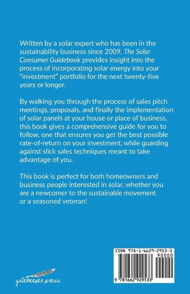 Written by a solar expert who has been in the sustainability business since 2009, The Solar Consumer Guidebook provides insight into the process of incorporating solar energy into your "investment" portfolio for the next twenty-five years or longer. By walking through the process of sales pitch meetings, proposals, and finally the implementation of solar panels at your house or place of business, this book gives a comprehensive guide for you to follow, one that ensures you get the best possible rate-of-return on your investment, while guarding against slick sales techniques meant to take advantage of you. This book is perfect for both homeowners and business people interested in solar, whether you are a newcomer to the sustainable movement or a seasoned veteran!