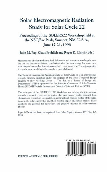 Measurements of solar irradiance, both bolometric and at various wavelengths, over the last two decades have established conclusively that the solar energy flux varies on a wide range of time scales, from minutes to the 11-year solar cycle. The major question is how the solar variability influences the terrestrial climate. The Solar Electromagnetic Radiation Study for Solar Cycle 22 (SOLERS22) is an international research program operating under the auspices of the Solar-Terrestrial Energy Program (STEP) Working Group 1: `The Sun as a Source of Energy and Disturbances'. STEP is sponsored by…mehr