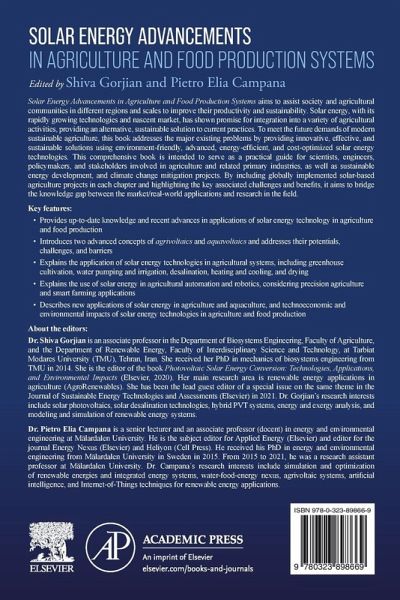 Dr. Shiva Gorjian is an associate professor in the Department of Biosystems Engineering, Faculty of Agriculture, and the Department of Renewable Energy, Faculty of Interdisciplinary Science and Technology, at Tarbiat Modares University (TMU), Tehran, Iran. She received her PhD in mechanics of biosystems engineering from TMU in 2014. She is the editor of the book Photovoltaic Solar Energy Conversion: Technologies, Applications, and Environmental Impacts (Elsevier, 2020). Her main research area is renewable energy applications in agriculture (AgroRenewables). She has been the lead guest editor of a special issue on the same theme in the Journal of Sustainable Energy Technologies and Assessments (Elsevier) in 2021. Dr. Gorjian's research interests include solar photovoltaics, solar desalination technologies, hybrid PVT systems, energy and exergy analysis, and modeling and simulation of renewable energy systems. Pietro Elia Campana is Associate Professor at the Future Energy Center, Department of Sustainable Energy Systems, Mälardalen University, Sweden. He is the head of the agrivoltaic research group at Mälardalen University and project leader of the first agrivoltaic systems in Sweden. He holds a PhD in Energy and Environmental Engineering from Mälardalen University. He is associate editor in the Elsevier journal Applied Energy (IF:11.2). His research interests include modelling, simulation, and optimization of agrivoltaic systems and integrated energy systems, machine learning for energy applications, solar irradiance assessment and water-food-energy nexus.