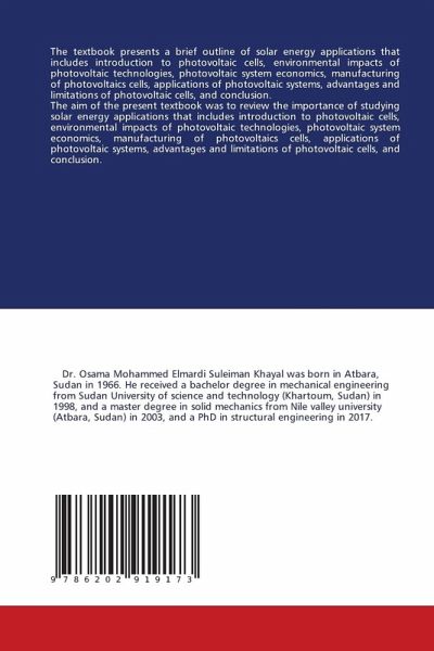 The textbook presents a brief outline of solar energy applications that includes introduction to photovoltaic cells, environmental impacts of photovoltaic technologies, photovoltaic system economics, manufacturing of photovoltaics cells, applications of photovoltaic systems, advantages and limitations of photovoltaic cells, and conclusion. The aim of the present textbook was to review the importance of studying solar energy applications that includes introduction to photovoltaic cells, environmental impacts of photovoltaic technologies, photovoltaic system economics, manufacturing of photovoltaics cells, applications of photovoltaic systems, advantages and limitations of photovoltaic cells, and conclusion.