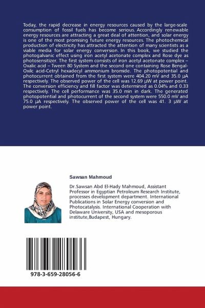 Today, the rapid decrease in energy resources caused by the large-scale consumption of fossil fuels has become serious. Accordingly renewable energy resources are attracting a great deal of attention, and solar energy is one of the most promising future energy resources. The photochemical production of electricity has attracted the attention of many scientists as a viable media for solar energy conversion. In this book, we studied the photogalvanic effect using iron acetyl acetonate complex and Rose dye as photosensitizer. The first system consists of iron acetyl acetonate complex - Oxalic acid - Tween 80 System and the second one containing Rose Bengal-Oxilc acid-Cetryl hexadecyl ammonium bromide. The photopotential and photocurrent obtained from the first system were 404.20 mV and 35.0 miA respectively. The observed power of the cell was 12.69 miW at power point. The conversion efficiency and fill factor was determined as 0.04% and 0.33 respectively. The cell performance was 35.0 min in dark. The generated photopotential and photocurrent of the second system were 550.0 mV and 75.0 miA respectively. The observed power of the cell was 41. 3 miW at power point.