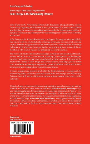 Solar Energy in the Winemaking Industry fully documents all aspects of the modern solar winery, beginning with the main drivers (environmental, economic and political) and detailing the current winemaking industry and solar technologies available. It details the various energy demands in the winemaking process from harvest to bottling and beyond.