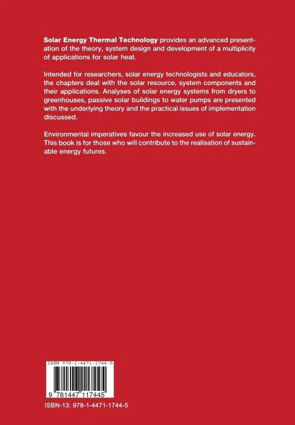 Solar Energy Technology deals with all aspects of solar energy systems. The fundamentals of predicting avail- ability; economic appraisal strategies; specific collector sub-systems, including a proven analytical procedure for predicting performance; and analyses of solar energy systems from dryers to greenhouses, passive solar buildings to water pumps, are covered in depth. Researchers and technologists need to have an insight into the challenges implementation entails, and this book presents practical constraints, operational considerations, and the latest research results. The book should be of great interest to students as well as professionals undertaking feasibility studies, development and implementation, technical assistance, and training assignments. Political action and pressure groups will also find the text useful for developing energy policies.