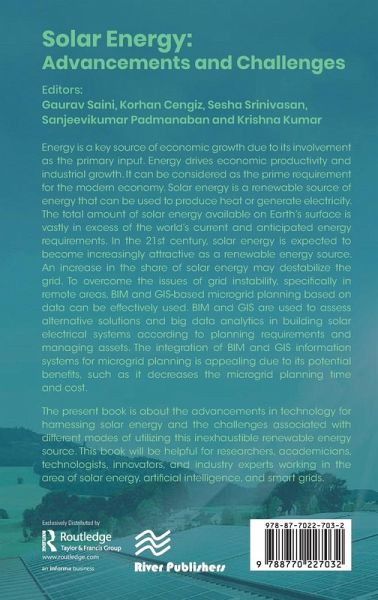 Energy is a key source of economic growth due to its involvement as the primary input. Energy drives economic productivity and industrial growth. It can be considered as the prime requirement for the modern economy. Solar energy is a renewable source of energy that can be used to produce heat or generate electricity. The total amount of solar energy available on Earth's surface is vastly in excess of the world's current and anticipated energy requirements. In the 21st century, solar energy is expected to become increasingly attractive as a renewable energy source. An increase in the share of solar energy may destabilize the grid. To overcome the issues of grid instability, specifically in remote areas, BIM and GIS-based microgrid planning based on data can be effectively used. BIM and GIS are used to assess alternative solutions and big data analytics in building solar electrical systems according to planning requirements and managing assets. The integration of BIM and GIS information systems for microgrid planning is appealing due to its potential benefits, such as it decreases the microgrid planning time and cost. The present book is about the advancements in technology for harnessing solar energy and the challenges associated with different modes of utilizing this inexhaustible renewable energy source. This book will be helpful for researchers, academicians, technologists, innovators, and industry experts working in the area of solar energy, artificial intelligence, and smart grids.