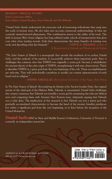 In The Solar Nature of Yahweh: Reconsidering the Identity of the Ancient Israelite Deity, the original nature of the chief god of the Hebrew Bible, Yahweh, is reexamined. Daniel Sarlo challenges the current consensus that Yahweh was initially a storm god by examining the relevant biblical texts and comparing them with Ancient Near Eastern texts, ultimately arguing that Yahweh was a solar deity. The implication of this research is that Yahweh was not a minor god who gradually accumulated characteristics to become the head of the ancient Israelite pantheon, but rather a significant god from the very beginning, or at least before the inception of the United Monarchy.