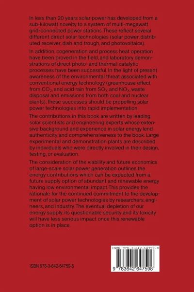 In the introductory and concluding chapters this book strive to satisfy the needs of the interested lay reader by addressing the potential, advantages, and costs of solar power plants. For the interested student, scientist, or technically oriented lay person the physical principles of insolation, its variability, concentration, and most efficient use are developed in some detail. Finally, experimental and theoretical developments in the recently created field of solar driven chemistry (via thermal, quantum, or electrical excitation) are described. The contributions in this book are written by leading solar scientists and engineering experts whose extensive background and experience in solar energy lend authenticity and completeness to the book. Design aspects of, and results from large experimental and demonstration plants are described by individuals who were directly involved in the design and testing of many of these plants. Consideration of the viability and future economics of large-scale solar power generation provides an outlook on the energy contributions which can be expected from an optional future supply of abundant and renewable energy, having little impact on the environment. This provides the rationale for the continued commitment to the development of solar power technologies by researchers, engineers, and industry. The eventual depletion of, or future political attacks on our energy supply will have less serious impact once this renewable option is in place.
