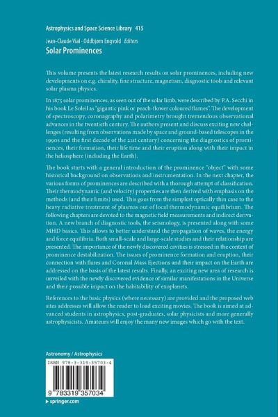 Jean-Claude Vial has been involved in Space Solar Physics for more than fourty-five years. He was Co-Investigator on several NASA satellite missions and space probes. He is also involved in the EUI and SPICE instrumentations for future ESA Solar Orbiter mission. He was scientific director of the Multi Experiment Data and Operations Center for SOHO in Europe until the end of 2000 and Head of the Solar and Stellar Group at I.A.S. until January 2005. He proposed various space solar missions in the frame of the C.N.E.S. microsatellite program, e.g. LYOT on-board the SMESE satellite, and in 2009, the LYOT-based ECLIPSE instrumentation in the frame of the ESA Proba 3 program. His main research interests are solar prominences, the chromosphere and transition  region, the solar corona. He is now Directeur de Recherche Emerite of C.N.R.S. Oddbjørn Engvold is Professor emeritus of the Institute of Theoretical Astrophysics, University of Oslo. His main field of research and teaching has been on the physics of Sun and stars. His research has involved solar and stellar dynamics and magnetic activity; with special interest in solar prominences. From 2003 to 2006 he was General Secretary of the IAU. Prof. Engvold was an editor of the journal Solar Physics and is a member of the editorial board of Solar Physics and the book series Astrophysics and Space Science Library.