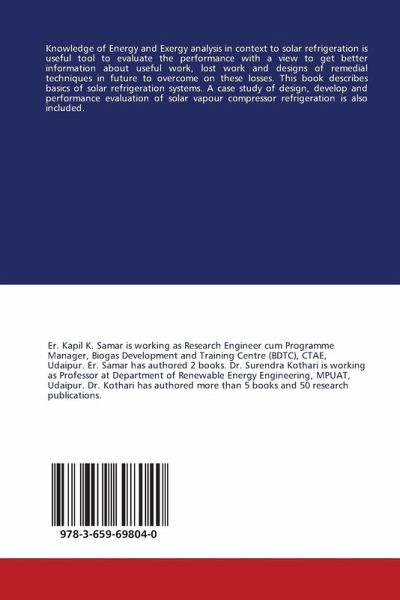 Knowledge of Energy and Exergy analysis in context to solar refrigeration is useful tool to evaluate the performance with a view to get better information about useful work, lost work and designs of remedial techniques in future to overcome on these losses. This book describes basics of solar refrigeration systems. A case study of design, develop and performance evaluation of solar vapour compressor refrigeration is also included.