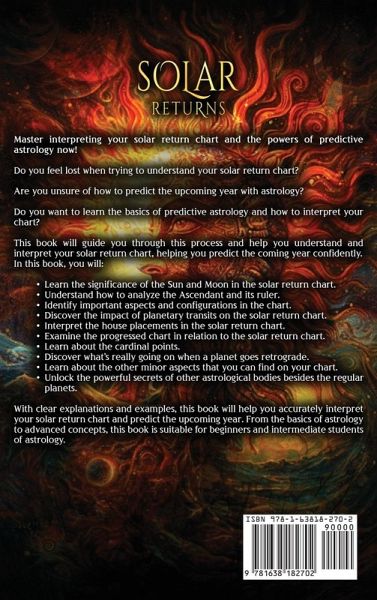 Master interpreting your solar return chart and the powers of predictive astrology now! Do you feel lost when trying to understand your solar return chart? Are you unsure of how to predict the upcoming year with astrology? Do you want to learn the basics of predictive astrology and how to interpret your chart? This book will guide you through this process and help you understand and interpret your solar return chart, helping you predict the coming year confidently. In this book, you will:Learn the significance of the Sun and Moon in the solar return chart. Understand how to analyze the Ascendant and its ruler. Identify important aspects and configurations in the chart. Discover the impact of planetary transits on the solar return chart. Interpret the house placements in the solar return chart. Examine the progressed chart in relation to the solar return chart. Learn about the cardinal points. Discover what's really going on when a planet goes retrograde. Learn about the other minor aspects that you can find on your chart. Unlock the powerful secrets of other astrological bodies besides the regular planets. With clear explanations and examples, this book will help you accurately interpret your solar return chart and predict the upcoming year. From the basics of astrology to advanced concepts, this book is suitable for beginners and intermediate students of astrology.