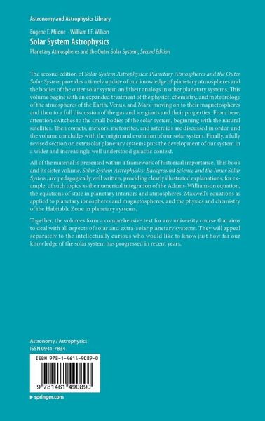 The second edition of Solar System Astrophysics: Planetary Atmospheres and the Outer Solar System provides a timely update of our knowledge of planetary atmospheres and of the bodies of the outer solar system and their analogs in other planetary systems. This volume begins with an expanded treatment of the physics, chemistry, and meteorology of the atmospheres of the Earth, Venus, and Mars, moving on to their magnetospheres and then to a full discussion of the gas and ice giants and their properties. From here, attention switches to the small bodies of the solar system, beginning with the natural satellites. The comets, meteors, meteorites, and asteroids are discussed in order, and the volume concludes with the origin and evolution of our solar system. Finally, a fully revised section on extrasolar planetary systems puts the development of our system in a wider and increasingly well understood galactic context.