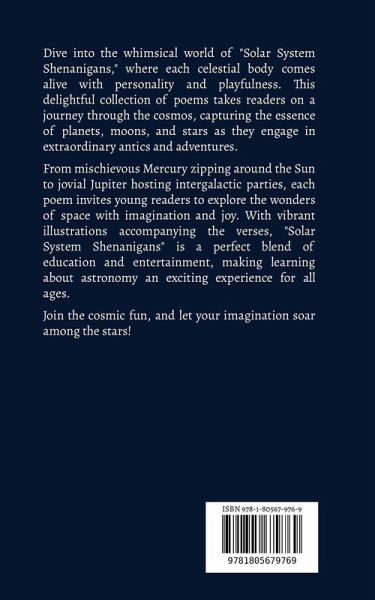 Dive into the whimsical world of "Solar System Shenanigans," where each celestial body comes alive with personality and playfulness. This delightful collection of poems takes readers on a journey through the cosmos, capturing the essence of planets, moons, and stars as they engage in extraordinary antics and adventures. From mischievous Mercury zipping around the Sun to jovial Jupiter hosting intergalactic parties, each poem invites young readers to explore the wonders of space with imagination and joy. With vibrant illustrations accompanying the verses, "Solar System Shenanigans" is a perfect blend of education and entertainment, making learning about astronomy an exciting experience for all ages. Join the cosmic fun, and let your imagination soar among the stars!