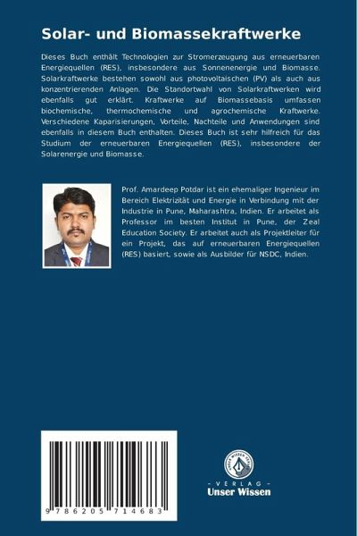 Dieses Buch enthält Technologien zur Stromerzeugung aus erneuerbaren Energiequellen (RES), insbesondere aus Sonnenenergie und Biomasse. Solarkraftwerke bestehen sowohl aus photovoltaischen (PV) als auch aus konzentrierenden Anlagen. Die Standortwahl von Solarkraftwerken wird ebenfalls gut erklärt. Kraftwerke auf Biomassebasis umfassen biochemische, thermochemische und agrochemische Kraftwerke. Verschiedene Kaparisierungen, Vorteile, Nachteile und Anwendungen sind ebenfalls in diesem Buch enthalten. Dieses Buch ist sehr hilfreich für das Studium der erneuerbaren Energiequellen (RES), insbesondere der Solarenergie und Biomasse.