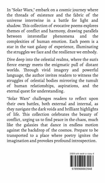 In "Solar Wars," embark on a cosmic journey where the threads of existence and the fabric of the universe intertwine in a battle for light and shadow. This collection of evocative poems explores themes of conflict and harmony, drawing parallels between interstellar phenomena and the complexities of human emotion. Each poem is a star in the vast galaxy of experience, illuminating the struggles we face and the resilience we embody. Dive deep into the celestial realms, where the sun's fierce energy meets the enigmatic pull of distant worlds. Through vivid imagery and powerful language, the author invites readers to witness the struggles of celestial bodies mirroring the tumult of human relationships, aspirations, and the eternal quest for understanding. "Solar Wars" challenges readers to reflect upon their own battles, both external and internal, as they navigate the dark voids and brilliant highlights of life. This collection celebrates the beauty of conflict, urging us to find peace in the chaos, much like the galaxies that dance in endless motion against the backdrop of the cosmos. Prepare to be transported to a place where poetry ignites the imagination and provokes profound introspection.