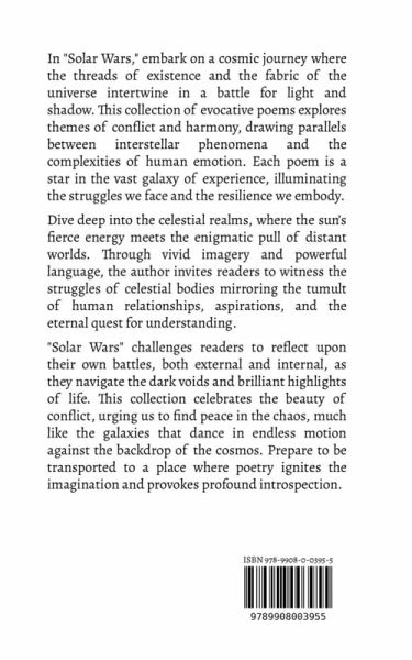 In "Solar Wars," embark on a cosmic journey where the threads of existence and the fabric of the universe intertwine in a battle for light and shadow. This collection of evocative poems explores themes of conflict and harmony, drawing parallels between interstellar phenomena and the complexities of human emotion. Each poem is a star in the vast galaxy of experience, illuminating the struggles we face and the resilience we embody. Dive deep into the celestial realms, where the sun's fierce energy meets the enigmatic pull of distant worlds. Through vivid imagery and powerful language, the author invites readers to witness the struggles of celestial bodies mirroring the tumult of human relationships, aspirations, and the eternal quest for understanding. "Solar Wars" challenges readers to reflect upon their own battles, both external and internal, as they navigate the dark voids and brilliant highlights of life. This collection celebrates the beauty of conflict, urging us to find peace in the chaos, much like the galaxies that dance in endless motion against the backdrop of the cosmos. Prepare to be transported to a place where poetry ignites the imagination and provokes profound introspection.