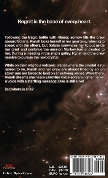 Book 2 in the Solaris Saga. A teen & young adult science fiction series full of action, adventure, mystery, and a little bit of time travel. Go to www.mcnultyjanet.com to learn more about the author and her works. Regret is the bane of every heart. Following the tragic battle with Klanor, sorrow fills the crew aboard Solaris. Rynah locks herself in her quarters, refusing to speak with the others, but Solaris convinces her to put aside her grief and continue the mission Marlow had entrusted to her. During a meeting in the ship's galley, Rynah and the crew resolve to pursue the next crystal. While on their way to a volcanic planet where the crystal is rumored to be, Rynah and her crew are almost killed by an ion storm and are forced to land on an outlying planet. While there, Rynah dreams she hears a familiar voice screaming her name, a voice with a startling message: Brie is still alive! But where is she?