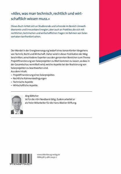 Dieses Buch ist aus der Wahrnehmung entstanden, dass es eines gemeinsamen Verständnisses und konzertierten Vorgehens von Vertretern aus Technik, Recht und Wirtschaft bedarf, um Solarvorhaben zu realisieren. Daher wird in dieser Publikation der Weg beschritten, verschiedene Experten aus den genannten Bereichen zum Thema Projektfinanzierung von Solarprojekten zu Wort kommen zu lassen, so dass in der Gesamtschau vermittelt wird, welche Aspekte bei der Realisierung von Solarprojekten zu beachten sind.