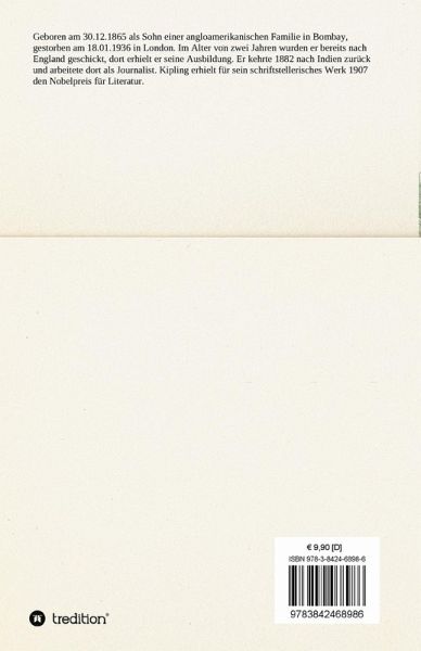 Geboren am 30.12.1865 als Sohn einer angloamerikanischen Familie in Bombay, gestorben am 18.01.1936 in London. Im Alter von zwei Jahren wurden er bereits nach England geschickt, dort erhielt er seine Ausbildung. Er kehrte 1882 nach Indien zurück und arbeitete dort als Journalist. Kipling erhielt für sein schriftstellerisches Werk 1907 den Nobelpreis für Literatur.