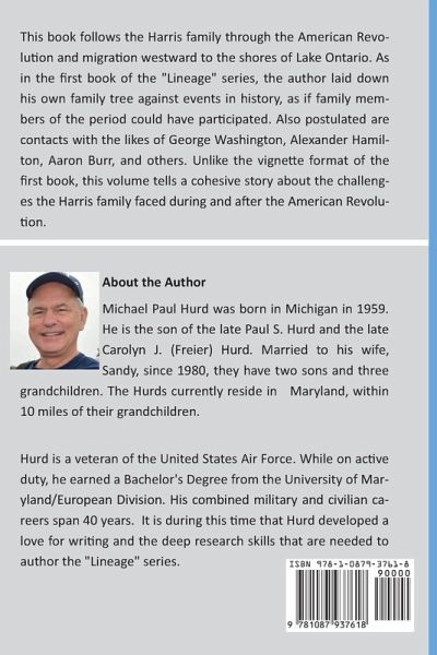 This book follows the Harris family through the American Revolution and migration westward to the shores of Lake Ontario. Thomas Harris was the soldier's soldier and was awarded a battlefield commission by General George Washington just before the Battle of Yorktown. After his release from his military obligations and suffering severe hardships, Harris and his family moved westward from Connecticut, across New York State. As in the first book of the "Lineage" series, the author laid down his own family tree against events in history, as if family members of the period could have participated. This book postulates contacts with the likes of George Washington, Alexander Hamilton, Aaron Burr, and others and is a sequel to Chapter Twelve of "Lineage: A Novel."