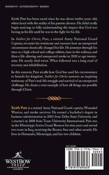 Keith Pate has been saved since he was about twelve years old; when faced with the reality of his parents divorce. He didn't really begin noticing or fully understanding the impact that God was having in his life until he was in the fight for his life. In Soldier for Christ, Pate, a retired Army National Guard Captain, recounts his testimony and narrates how an unexpected circumstance drastically changed his life. He journeys through his time as a high school and college athlete, time in the military, and then a life-altering and unexpected stroke in 2010 at age twenty-nine. He nearly died twice. What followed was a long road of recovery and rehabilitation. In this memoir, Pate recalls how God has used his circumstance to benefit his kingdom. Soldier for Christ narrates an inspiring testimony of Pate's real-life struggle and survival of an unexpected challenge. He shares a true example of how all things are possible through Christ.