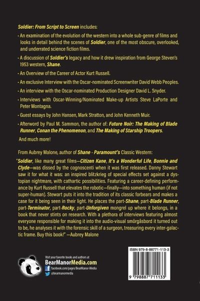 Soldier: From Script to Screen includes: An examination of the evolution of the western into a whole sub-genre of films and looks in detail behind the scenes of Soldier, one of the most obscure, overlooked, and underrated science fiction films. A discussion of Soldier's legacy and how it drew inspiration from George Steven's 1953 western, Shane. An Overview of the Career of Actor Kurt Russell. An exclusive Interview with the Oscar-nominated Screenwriter David Webb Peoples. An interview with the Oscar-nominated Production Designer David L. Snyder. Interviews with Oscar-Winning/Nominated Make-up Artists Steve LaPorte and Peter Montagna. Guest essays by John Hansen, Mark Stratton, and John Kenneth Muir. Afterword by Paul M. Sammon, the author of: Future Noir: The Making of Blade Runner, Conan the Phenomenon, and The Making of Starship Troopers. And much more! "Soldier, like many great films-Citizen Kane, It's a Wonderful Life, Bonnie and Clyde-was dissed by the cognoscenti when it was first released. Danny Stewart saw it for what it was: an inspired blitzkrieg of special effects set against a dystopian nightmare, with cathartic possibilities. Featuring a career-defining performance by Kurt Russell that elevates the robotic-finally-into something human (if not super-human). Stewart puts it into the tradition of its classic forbears and makes a case for it being seen in their light. He places the part-Shane, part-Blade Runner, part-Terminator, part-Rocky, part-Unforgiven mongrel up where it belongs, in a book that never stints on research. With a plethora of interviews featuring almost everyone responsible for making it into the audio-visual smörgåsbord it turned out to be, he analyses it with the forensic skill of a surgeon, treasuring every inter-galactic frame. Buy this book!" - Aubrey Malone, author of Shane - Paramount's Classic Western