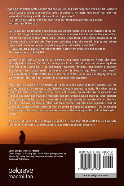 "Why did the United States invade and occupy Iraq, and what happened when we did? Soldiers and Citizens provides a compelling series of answers. No matter how much you think you know about the Iraq war, this book will teach you more." - Stephen Kinzer, former New York Times correspondent and Visiting Scholar, Northwestern University "Carl Mirra has put together a remarkable and moving collection of oral histories of the war in Iraq. He brings into direct dialogue veterans who opposed and supported the war, policy-makers who resigned their office out of principle and those who remain convinced of the righteousness of their policies. These are fascinating clips of a war still in progress, whose origins and course will remain disputed long after it is finally concluded." - Dr. Marilyn B. Young, Professor of History, New York University and author of The Vietnam Wars, 1945-1990 "Whether described as occupied or liberated, Iraq usually generates widely divergent, strongly held opinions.Carl Mirra's book presents all sides of the issue, as seen by those engaged in the struggle. It is compelling, balanced, rational and thought-provoking. The issues are complicated; the presentation is hard-hitting. Read it and learn."