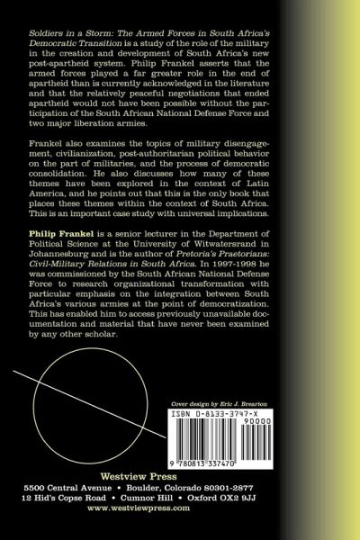 Soldiers in a Storm: The Armed Forces in South Africa's Democratic Transition is a study of the role of the military in the creation and development of South Africa's new post-apartheid system. Philip Frankel asserts that the armed forces played a far greater role in the end of apartheid than is currently acknowledged in the literature, and that the relatively peaceful negotiations that ended apartheid would not have been possible without the participation of the South African National Defense Force and two major liberation armies.Frankel also examines the topics of military disengagement, civilianization, post-authoritarian political behavior on the part of militaries, and the process of democratic consolidation. He also discusses how many of these themes have been explored in the context of Latin America, and he points out that this is the only book that places these themes within the context of South Africa. This is an important case study with universal implications.