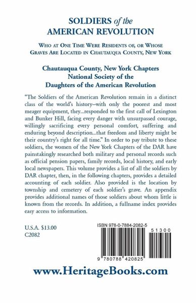 "The Soldiers of the American Revolution remain in a distinct class of the world's history-with only the poorest and most meager equipment, they...responded to the first call of Lexington and Bunker Hill, facing every danger with unsurpassed courage, willingly sacrificing every personal comfort, suffering and enduring beyond description...that freedom and liberty might be their country's right for all time." In order to pay tribute to these soldiers, the women of the New York Chapters of the DAR have painstakingly researched both military and personal records such as official pension papers, family records, local history, and early local newspapers. This volume provides a list of all the soldiers by DAR chapter, then, in the following chapters, provides a detailed accounting of each soldier. Also provided is the location by township and cemetery of each soldier's grave. An appendix provides additional names of those soldiers about whom little is known from the records. In addition, a fullname index provides easy access to information.
